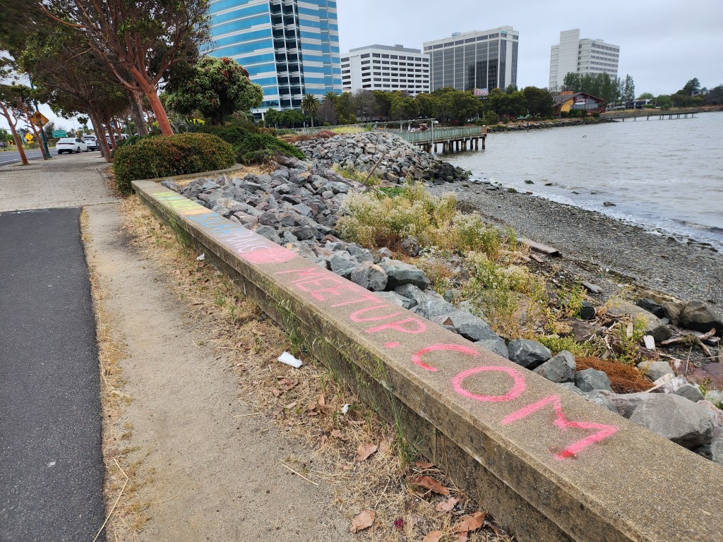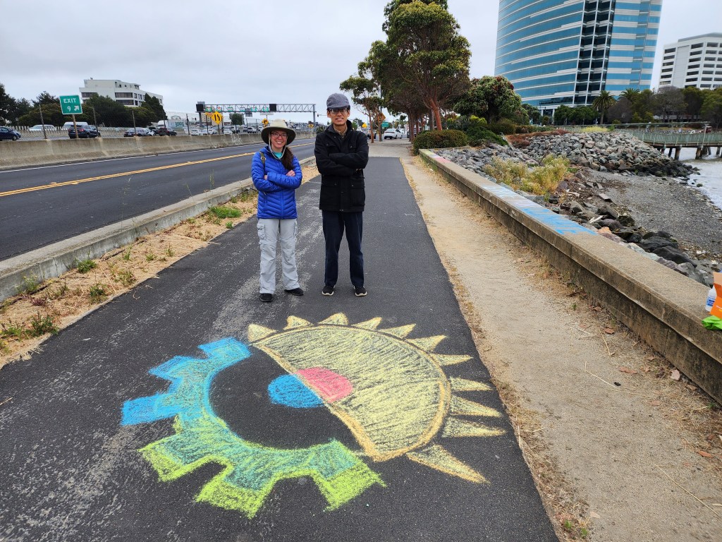 On June 17th 2023 some of our members completed some chalk graffiti to get the word out about our group and solarpunk in general. We completed 4 works, with three being shorter sentences and one being our interpretation of a common solarpunk logo.