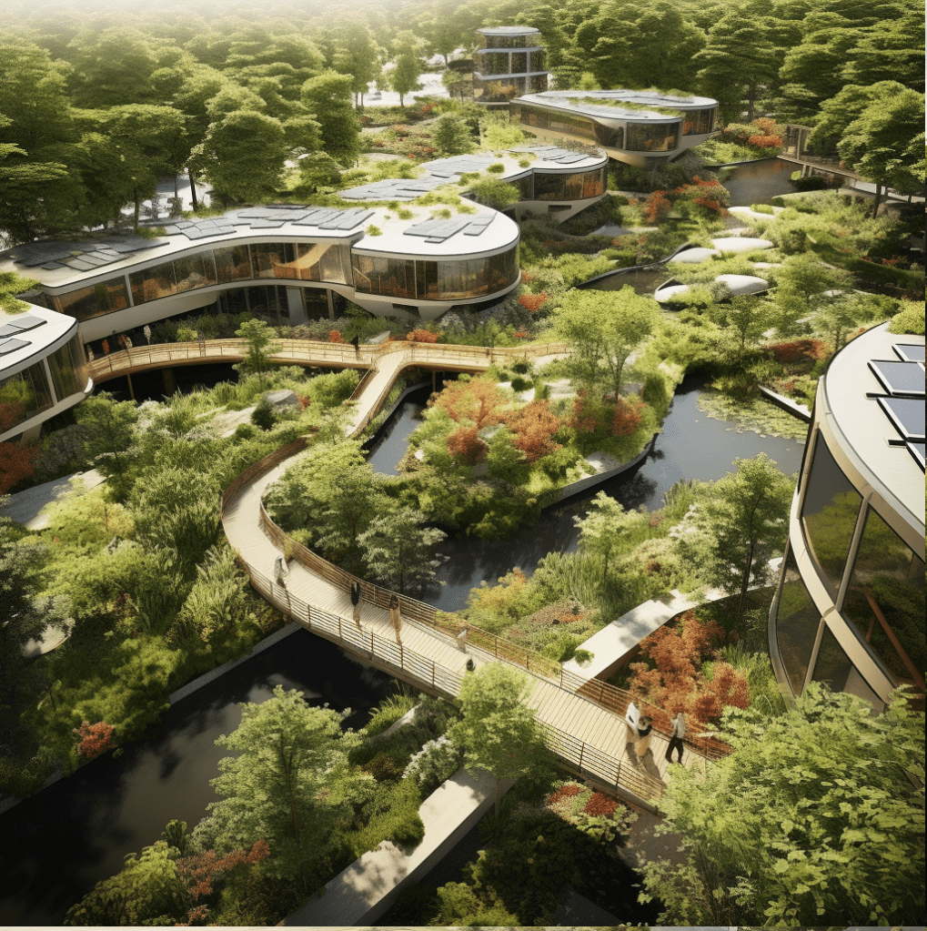 Sustainable village–gardens, woodland, stream, apartment, solar panels